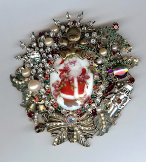 I'd like to introduce my newest doll creation, "Gypsy Jewel". She is a one of a kind, 17" all cloth doll over wire armature. Her face is hand sculpted and painted, costume was made using lots of fancy fabrics, Vintage Lace, Vintage Jewelry bits, naturally lots of glitz and sparkle, including, Swarovski crystalsl, assorted beads, gypsy coin chain, charms, sequins, tarot cards and so much more. I tried to make a Tambourine and ended up making a Music maker thingy around her right hand using a piece of suede as the base, Vintage Bells and Swarovski Crystals. The last picture shows it close up. She is loaded with embellishments and has a simple wooden base that I painted black. There is no pattern available.